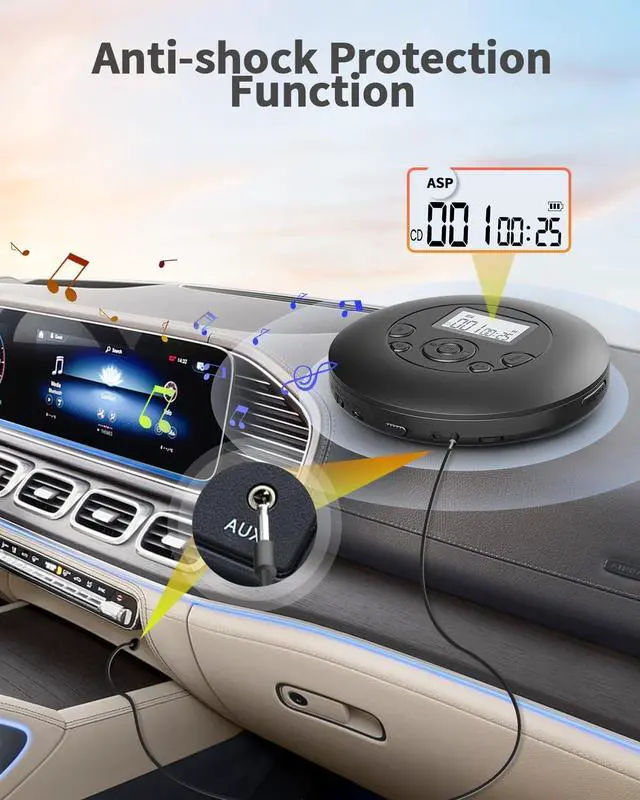 RECHARGEABLE & ON-THE-GO PORTABLEThis rechargeable CD player delivers up to 7 hours of continuous playback after full charge, easily charged via car USB jack or any USB power source. Its compact design makes it a perfect companion for road trips, camping, home use, or daily commutes, no need for bulky power adapters. ^^ CAR-FRIENDLY WITH AUX CONNECTION Included 3.5 mm AUX cable allows seamless connection to car speakers or external speakers, filling your journey with favorite CD music. The package also comes with wired headphones for private listening in quiet environments like libraries, planes, or late-night study sessions.