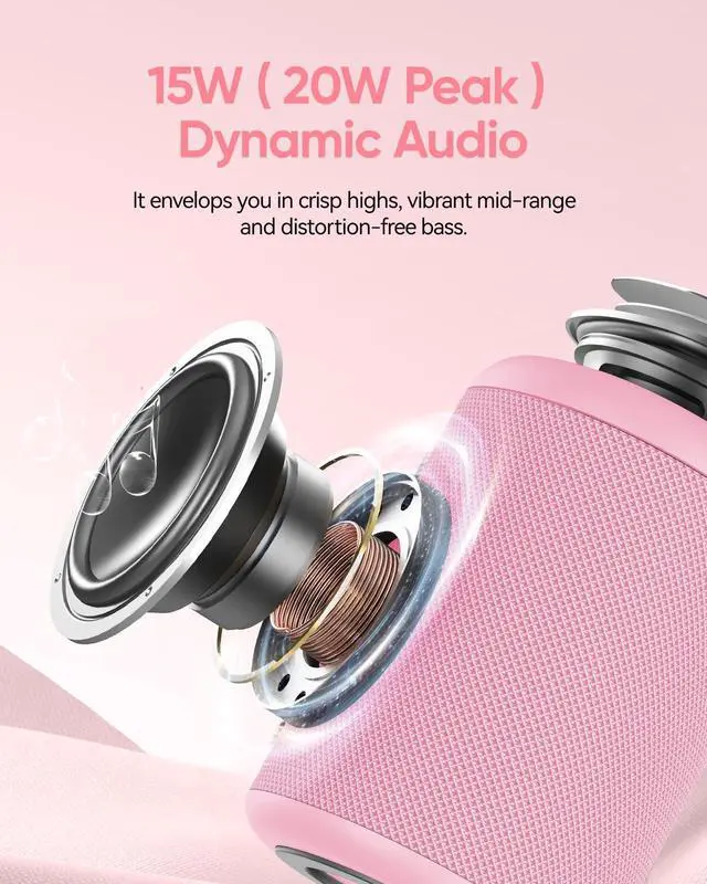 The built-in lanyard lets you hang it on a beach umbrella, bike, or shower caddyso your music stays close, wherever you are ^^ Dynamic Light Show Sets the Vibe Day or Night As the sun sets on the beach, let the beat-syncing LED lights turn your bonfire gathering into a glowing party. By day, its a fun accent for poolside lounging; by night, it transforms your bedroom, dorm, or backyard BBQ into a mini celebration. The lights dance to your music, adding energy to every momentwhether you're hosting or just chilling ^^ Crystal-Clear Sound & 15H Battery From Sunrise to Late Night Powerful 15W (20W peak) audio with zero distortion fills the spacewhether you're on a crowded beach, in the living room, or cooking in the kitchen.