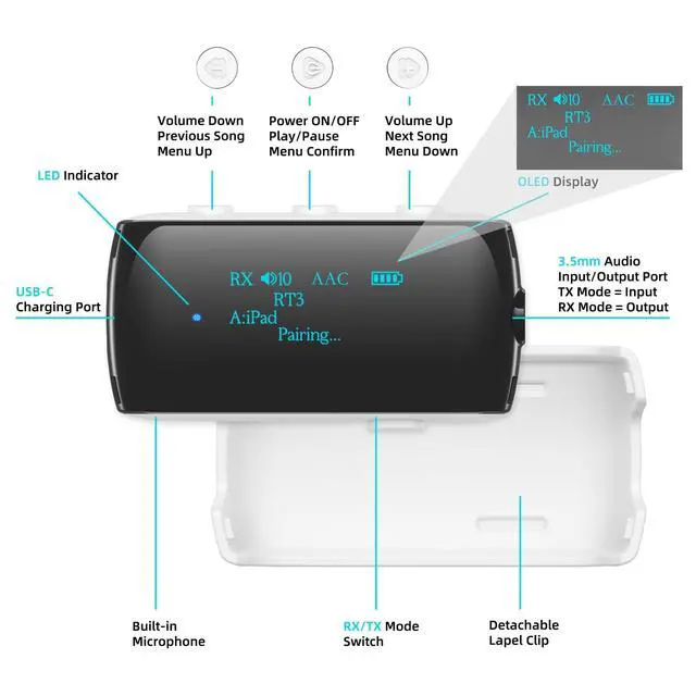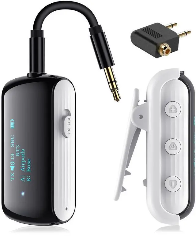 Bluetooth Transmitter Receiver: Switch between TX (Transmitter) mode to wirelessly transmit audio from TVs, game, treadmills, MP3 player, tablets and airplane entertainment systems to Bluetooth headphones, earbuds, or speakers via a 3.5 mm cable. An extra International Airline Adapter is included, fitting various airplane audio interfaces for improved compatibility. RX (Receiver) mode allows you to connect smartphones wirelessly to wired speakers, earphones, Auto, boat, or home stereos. ^^ Built-in OLED and