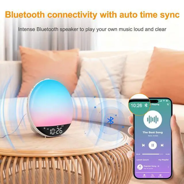 (10-480 mins timer duration optional). ^^ Steady Bluetooth Connectivity to Auto Time Sync Flawless Bluetooth connection with intense speaker will give you a wonderful music experience while synchronize the clock time with your phone, avoid the setting hassle. ^^ Natural Wake Up Light Sunrise Alarm Clock Waking revitalized with simulated sunrise light. 20 modifiable wake up light brightness and 0-60 mins sunrise duration that helps you get up refreshed. If you dont like the sun light lamp, you can also set a sound only alarm. ^^ Alarm Clock with Custom Snooze You can arrange your time reasonably by using this alarm clocks for bedrooms with 5-30 mins snooze.