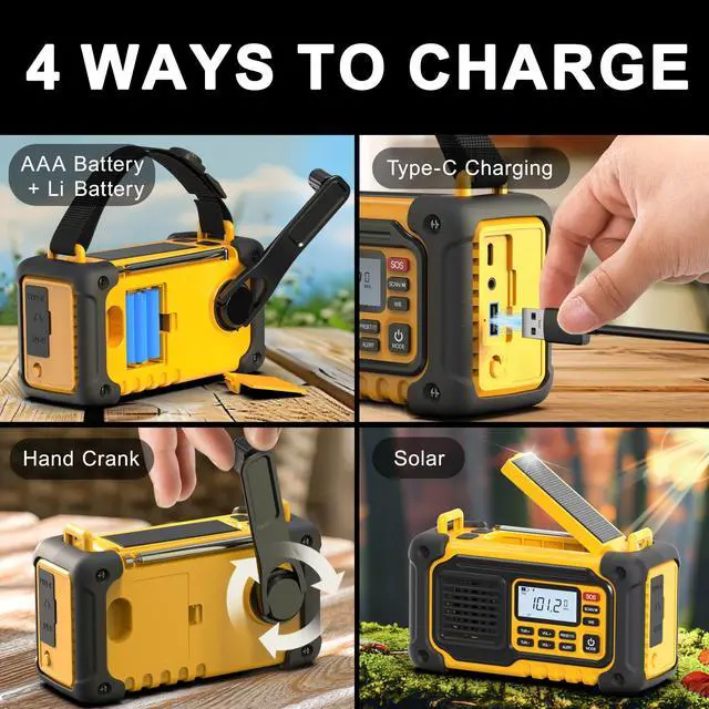 It features six charging methods: a built-in rechargeable battery, an AC adapter, a DC 5V USB input, hand-crank power generation, a solar panel, and compatibility with three AAA batteries (not included). These diverse options ensure that the radio remains powerful and dependable, providing instant and automatic weather alerts around the clock. ^^ SUPER-BRIGHT FLASHLIGHT AND TWO MODE READ LAMP - If you are an camping enthusiast or have to walk in some places without any lights, this solar flashlight radio with 3 modes flashlight is a perfect choice, whose farthest lighting range exceeds10m, is farther than the most other crank weather radios. Meanwhile, a reading lamp with two confortable light levels will extremely help you get up in the mid-night to avoid waking up your families. Add to cart and get it, you will never regret to purchase this crank flashlight radio! ^^ 7 X 24H ON-LINE SERVICE - In the past years, Our emergency weather radio has helped many many USA Civilians to live through the hurricane, tornadoes and snowstorm season. Your Recognition and panegyrizes drives us to be the best. If you are not satisfied with this NOAA am/fm weather radio, the total amount will refund you immediately as you contact us.