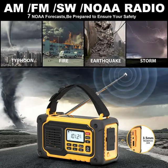 NOAA ALERT WEATHER RADIO - High accuracy NOAA weather alert radios are specialized design for emergency need. Turn on it and manually tune into local weather station to receive alerts. It offers standard analog tuning of AM/FM/SW/7 preset NOAA weather channels. The hand crank raido is a particular radios which receives emergency warnings for various life-threatening weather events such as hurricanes, cyclones, tsunamis, and other weather disasters. ^^ MULTI-FUNCTION IN ANYTIME - The upgraded 10000mAh/37000mWh hand crank weather radios is much enough to charge phones or other USB devices to write a text message or have a brief call in an emergency.