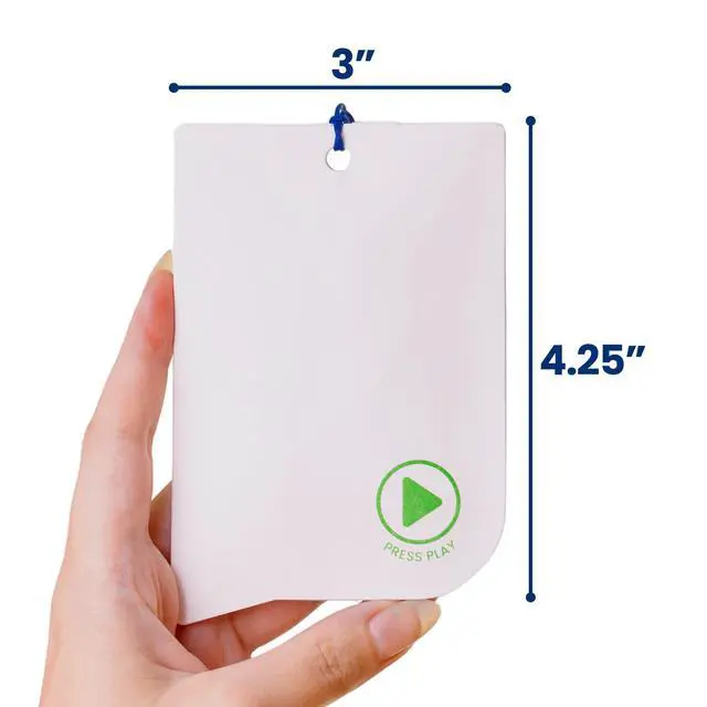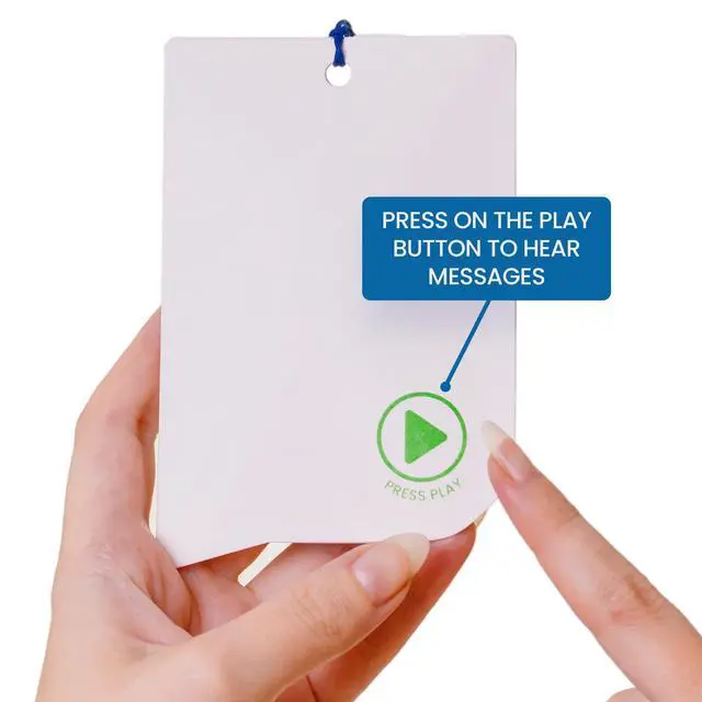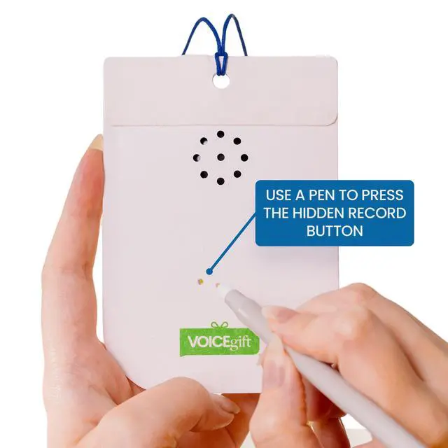 Make Every Gift Unforgettable These recordable gift tags hold up to 60 seconds of audio. Add one or more voice messages, songs, or sounds to gifts, cards, or keepsakes. Just press to play, turning any moment into lasting joy. ^^ Decorate & Personalize Write, draw, or design on acid-free custom sound cards. Add doodles, stickers, or notes to your voice recorder card. Includes a decorative cord to hang it, gift it, or mail it as a voice recordable greeting card. ^^ Record & Re-Record with Ease Press and hold to record your own message card, and change it anytime.
