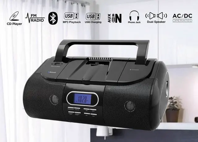 Portable CD/MP3/USB Boombox, FM PLL Radio, Bluetooth, 1 USB Port for MP3 Playback, 1 USB Port for 1A Charging, Aux-In Jack, Headphone Jack, AC/DC Dual Power Source.