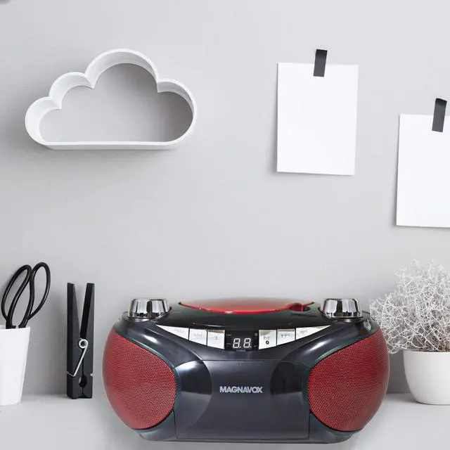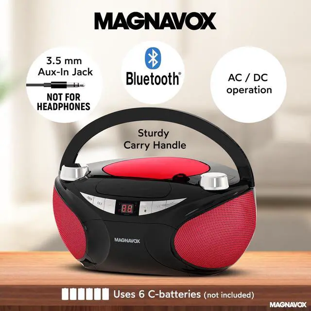 Enjoy music your way with the Magnavox CD Boombox with Bluetooth. This features a compact, versatile design that is able to keep up with the fast paced world that we all live in. Listen to your favorite music in a variety of ways including CD's, AM/FM radio stations, Bluetooth connectivity, or connect to your phone/MP3 player with an AUX cord. Great for at home use, or take it on-the-go with the option of powering it with 6 C batteries (not included).
