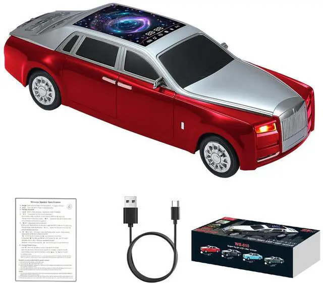 LED starry sky screen Display Panel on Roof A distinctive LED starry sky screen displays colorful visual effects that synchronize with your music, creating a vibrant party mood ^^ Luxury Sedan Replica Design Crafted with sleek contours, chrome-like accents, and movable wheels, this model doubles as a Bluetooth speaker and a desktop collectible ^^ HD Sound & TWS Stereo Pairing Delivers crisp, high-definition sound from dual 20W drivers. Connect two WS-610 units via TWS for immersive stereo performance ^^ Multiple Playback Options Stream via Bluetooth 5.4 or enjoy music through USB, TF card, or built-in FM radio; ideal for both home audio and outdoor use ^^ Hands-Free & Type-C Charging Built-in microphone supports hands-free calls.