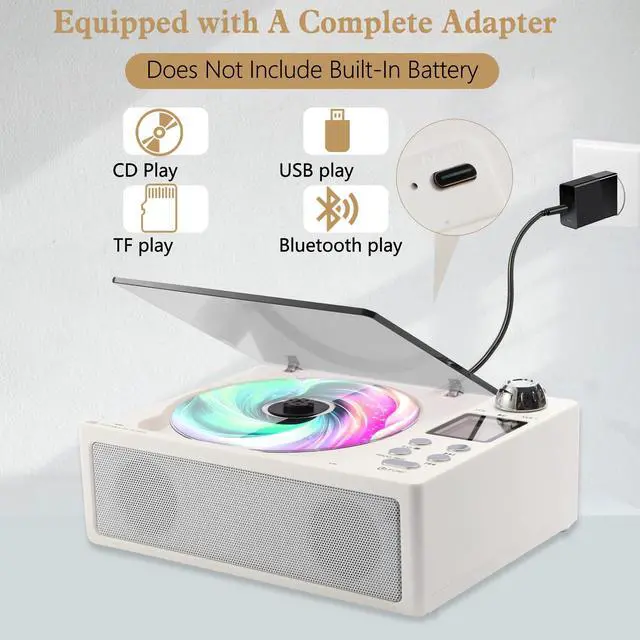7-in-1 Multi-Function CD PlayerEnjoy CDs, Bluetooth, FM radio ( 87.5 -108MHz), USB/AUX/TF playback. Features Hi-Fi sound with 5 EQ modes, optical output for lossless audio. 4000mAh battery, remote control. Retro design with LCD display, portable ( 7.565. 982.76 in, 1.65 lbs). Perfect for home & travel.! 1.8 -in-1 CD Player-Play CDs, Bluetooth, FM radio, USB/AUX/TF & optical output. Remote included. Compact & portable. 2. Retro Design-Classic square CD player with knob, dust cover & LCD. Vintage look, modern tech.
