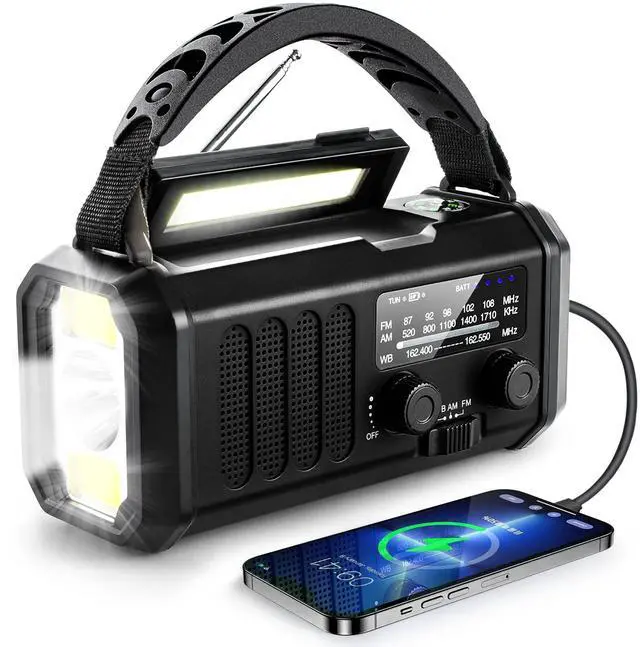 Necessary for emergencies - built-in rechargeable battery with 10000 mAh for charging the mobile phone and tablet in an emergency, This emergency weather crank radio can reliably receive the latest emergency weather forecasts of NOAA and AM/FM radio stations, Emergency portable radio, a super bright torch with 3 modes, a reading lamp, SOS alarm, a hand crank and a solar panel for charging the battery. 48 LED Reading Lamp with 20 LED Flashlight ^^ 3 charging modes the emergency radio with built-in 10000 mah Polymer Battery can not only be charged via a USB Type-C cable, but you can also power the emergency radio via the hand crank and solar panels to ensure that you can use the radio crank normally in an emergency.