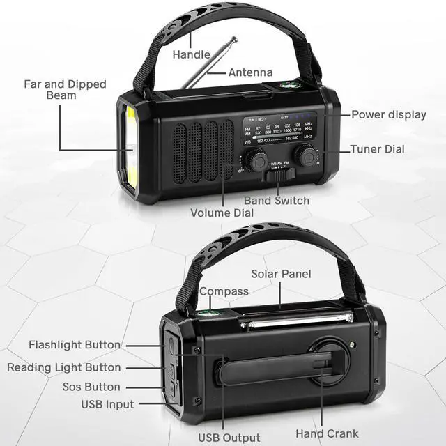 SOS alarm: this solar radio has built-in 3 LED torch modes and 1.3 W reading light There is an SOS siren and Compass. SOS siren can trigger a loud alarm and can be heard far to quickly attract attention and seek help. Compass can help you not get lost. ^^ You can quickly get the daily forecast by turning the knob instead of turning the knob up and down. FM / AM radio receives good reception and short wave transmitters even when the antenna is switched off (AM: 520-1710khz, FM: 87-108MHZ, NOAA: 162.400 - 162.550MHZ ). ^^ Small and waterproof- it is small and handy (160 x90x 80 mm), a weight of 500 g, with IPX3 protected against spray water at an angle of 60. It does not take up much space when stored, and you can carry it anywhere in any bag or handbag.