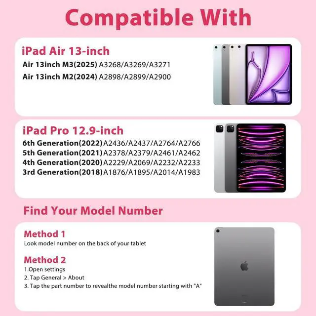 Model: Compatible only for iPads air 13 inch M2 2024 (A2900/A2899/A2898) for iPads Pro 12.9 inch 6th Generation 2022 (A2436/A2437/A2764/A2766) for iPads Pro 12.9 inch 5th Generation 2021 (A2378/A2379/A2461/A2462) these 3 iPads models. Please check your iPads model before placing an order.