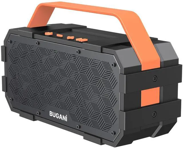 30W SUPER POWER Bugani Bluetooth speakers are equipped with 30W of stereo audio drivers and an advanced digital signal processor, which pumps out crisp treble, detailed mids, and specially enhanced bass at any volume. Configuration with loud stereo sound output devices that can play perfectly without distortion even at maximum volume. ^^ SHOCKING BASS Wireless speaker is named after its main feature: Super Bass. Feel the heart-beating super bass provided by two 3-inch drivers and an extra large passive radiator. The latest stereo driver can ensure more accurate bass and midrange. The perfect sound quality makes the portable speaker ideal for indoor and Outdoor travel. ^^ MULTIPLE PLAYBACK MODES Wireless Bluetooth speakers with multiple playback modes allow you to enjoy different music. A portable Bluetooth speaker not only supports Bluetooth connection but supports TF card/AUX, Powerful loudspeaker provides a vivid sound life for a fantastic dynamic audio experience. ^^ FALL PREVENTIONUses the latest material to protect the Bluetooth speaker from impact, thus ensuring that it will not be damaged when dropped from 3 feet. The metal frame can well protect the large speaker and ensure sound quality playback is not damaged, Ideal for travel, camping, and outdoor adventures. Enjoy music all day long. ^^ 24-HOUR PLAYBACK TIMEOutdoor party speaker is built large capacity battery, and one full charge lets you play music for up to 24 hours (Playtime varies according to volume level and audio content). It's a good helper for a room get-together or a pool dancing party.