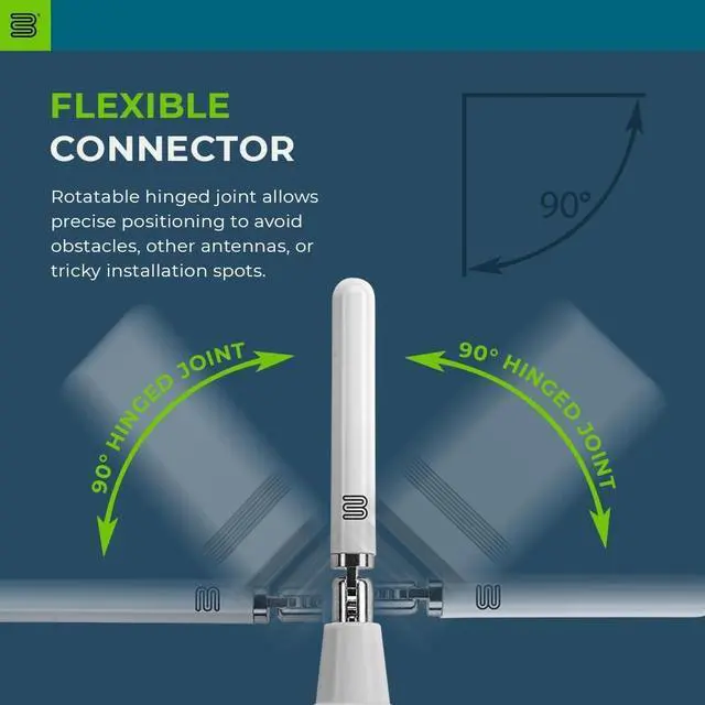 ^^ FLEXIBLE CONNECTOR: Rotatable hinged joint allows precise positioning to avoid obstacles, other antennas, or tricky installation spots.