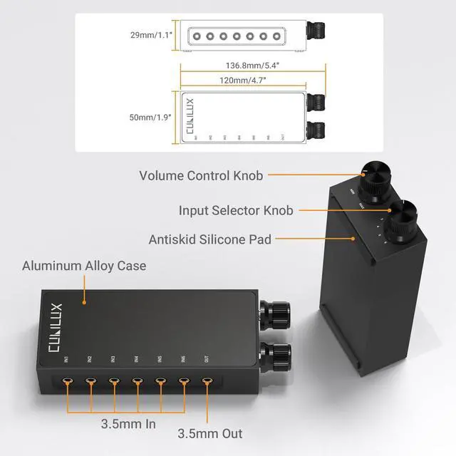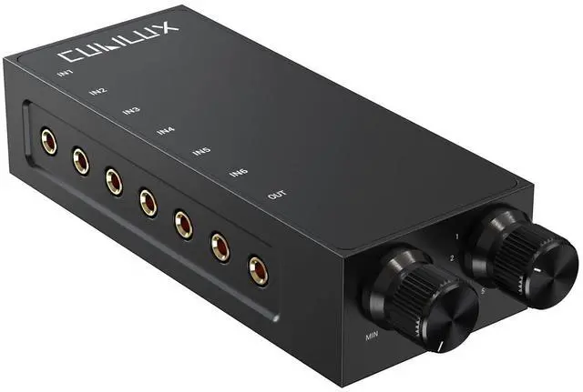 6 Input to 1 Output Stereo Audio SwitchEquipped with a 3.5 mm TRS stereo interface and a 6-in-1-out design, allowing you to connect up to six audio sources and share a single output device (one input active at a time). Fully passive circuit, plug and play with no driver or external power required. ^^ Input Selector & Volume KnobFeatures two independent rotary knobs: one for switching between the six input channels, and one for adjusting the output volume including full mute when needed. ^^ Lossless Sound QualityThe full aluminum alloy housing provides effective shielding against electronic interference, helping maintain clean, stable audio transmission without static, humming, or ground noise. ^^ Wide CompatibilityWorks with most devices that use a 3.5 mm TRS stereo audio port, such as headphones, earphones, speakers, soundbars, laptops, PCs, smartphones, tablets, MP3 players, and amplifiers. ^^ Perfect for Desktop Audio SetupsFeatures a non-slip silicone base that keeps the switcher stable on any desk surface.