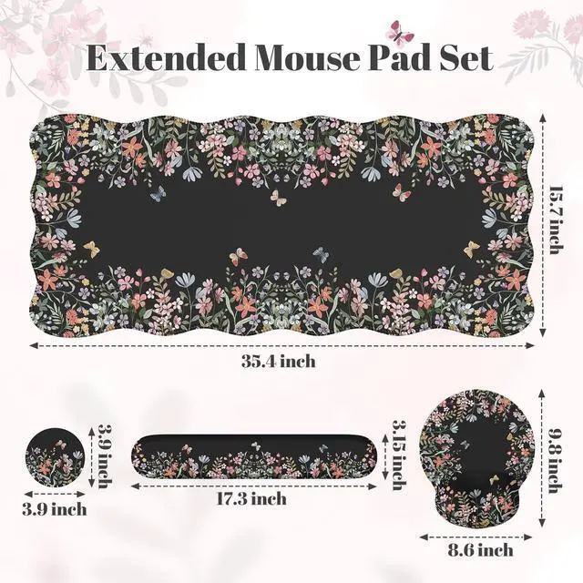 Desk Mat SetExtended size: 15.7 x 35.4 x 0.1 Ultra large size Desk Mat with soft surface, it's enough to cover your mouse, gaming keyboard and other desk items. Wrist rest for computer keyboard 17.32"" x 3.15"", wrist support mouse pad 10.6"" x 8.9"", coaster: 3.93"" x 3.93"".