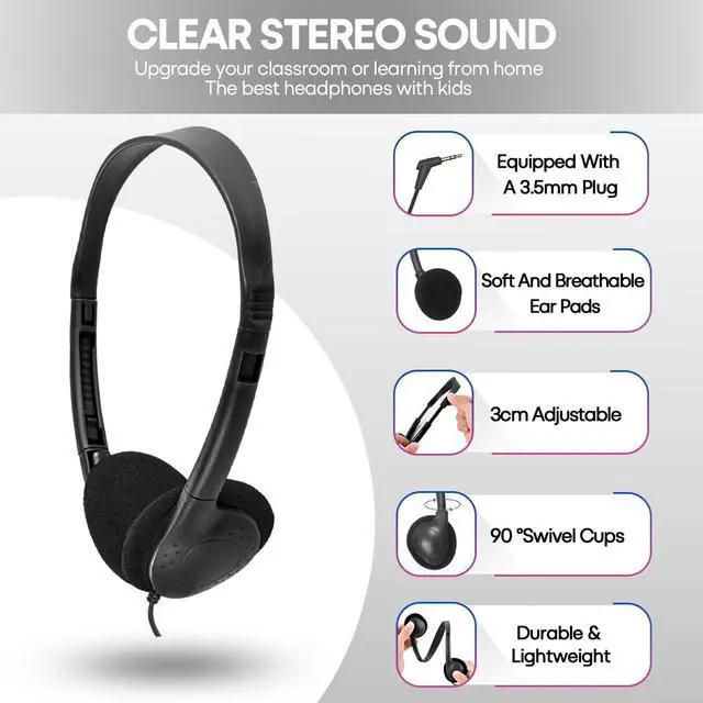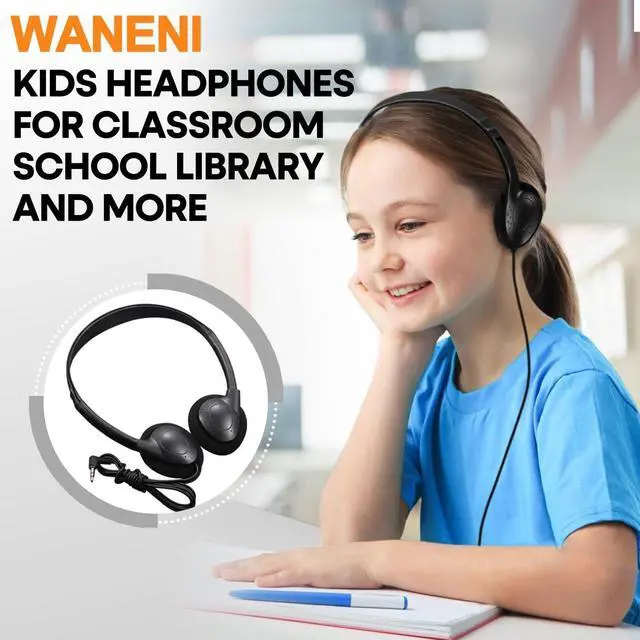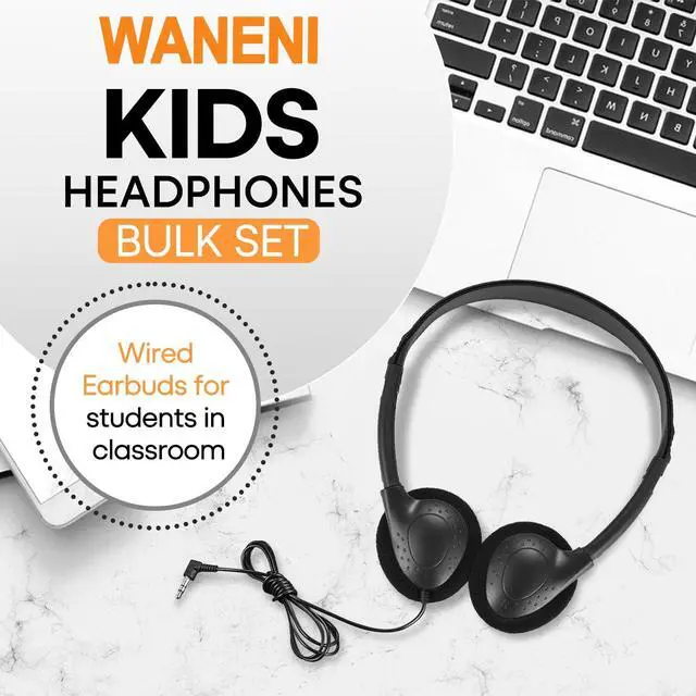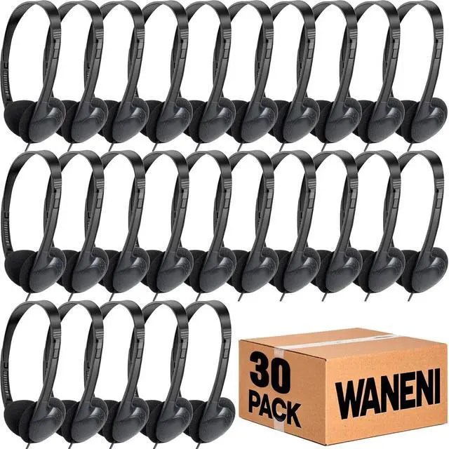 Equip your entire classroom with these reliable Waneni on-ear headphones, perfect for educational settings. This bulk pack of 30 pack headphones features a classic wired design with standard 3.5 mm audio jacks, making them compatible with most classroom devices and audio equipment. The adjustable headband ensures a comfortable fit for students of different ages, while the padded ear cushions provide extended wearing comfort during learning sessions. These durable headphones are specifically designed for classroom use, offering clear audio quality for educational content, language labs, and multimedia activities. The sturdy construction helps them withstand daily student use, while the simple plug-and-play functionality means no complicated setup is required.