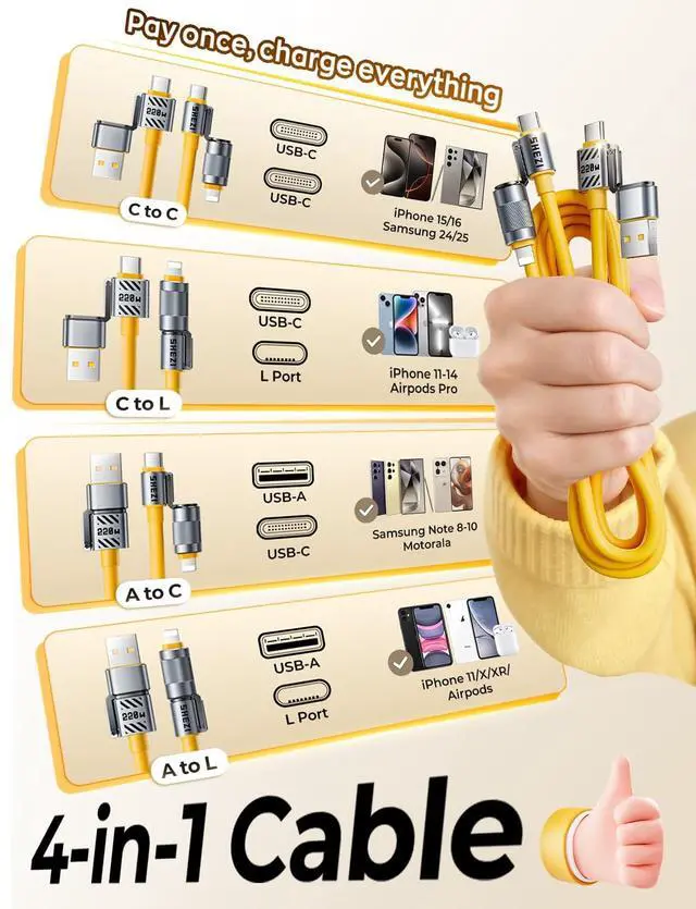 Reliable Professional SupportTo show our confidence in the quality of our products, we offer you a lifetime replacement. If you encounter any problems while using the cable, don't hesitate to get in touch with us via the Message Center - we are more than happy to assist you ^^ The All-Device Key & 4-in-1 CableStill bothered by having to carry a bunch of charging cables every time you travel? This Jixivor 4 in 1 charging cable is your ultimate gear. 4in1 fast charging cable features 4 ports: [USB C to USB C] [USB C compatible with Lightning] [USB A to USB C] [USB A compatible with Lightning], compatible with iPhone, Tablet, Air Mini Pro, Macbook and More. With this 4 in 1 usb cable in hand, you can take care of all charging needs ^^ No Wait, Nice ThingsThe Jixivor compatible with Lightning cable output power up to 220W, which is ensured by high-speed safe charging In order to make your devices get charged in an instant, we've adopted silver-plated conductors, cut down the resistance and beefed up the copper core, thus creating a compatible with Lightning-fast power pathway. According to our calculations, compared to before, you can save 17 min for each full charge when using our data cables ^^ Silicone Cables, 20 Years NewMade of extra-thick silicone, usb a to usb c cable has an extremely soft and smooth touch, just like a baby's skin. USB to compatible with Lightning cable can withstand up to 56, 792 bends! compatible with Lightning charger cables for iphone may seem soft, but in fact, it is extremely tough.