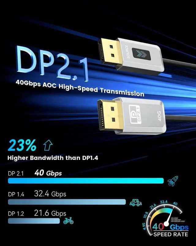^^ Born for Enthusiast eSports GamersThis DP 2.1 cable is a four-core optical fiber with multiple internal shielding and a latch-free design. The 24K gold-plated connector is anti-corrosion and more durable. It has high anti-electromagnetic interference and anti-RF interference capabilities and can withstand more than 35, 000 times. Bend tested without affecting cable flexibility and ensuring optimal performance. ^^ Wide CompatibilityOur display port 2.1 AOC can be used on all devices with DisplayPort interfaces. Plug and play, backward compatible with DisplayPort 2.0 / 1.4 / 1.3 / 1.2 / 1.2A / 1.1 / 1.0.
