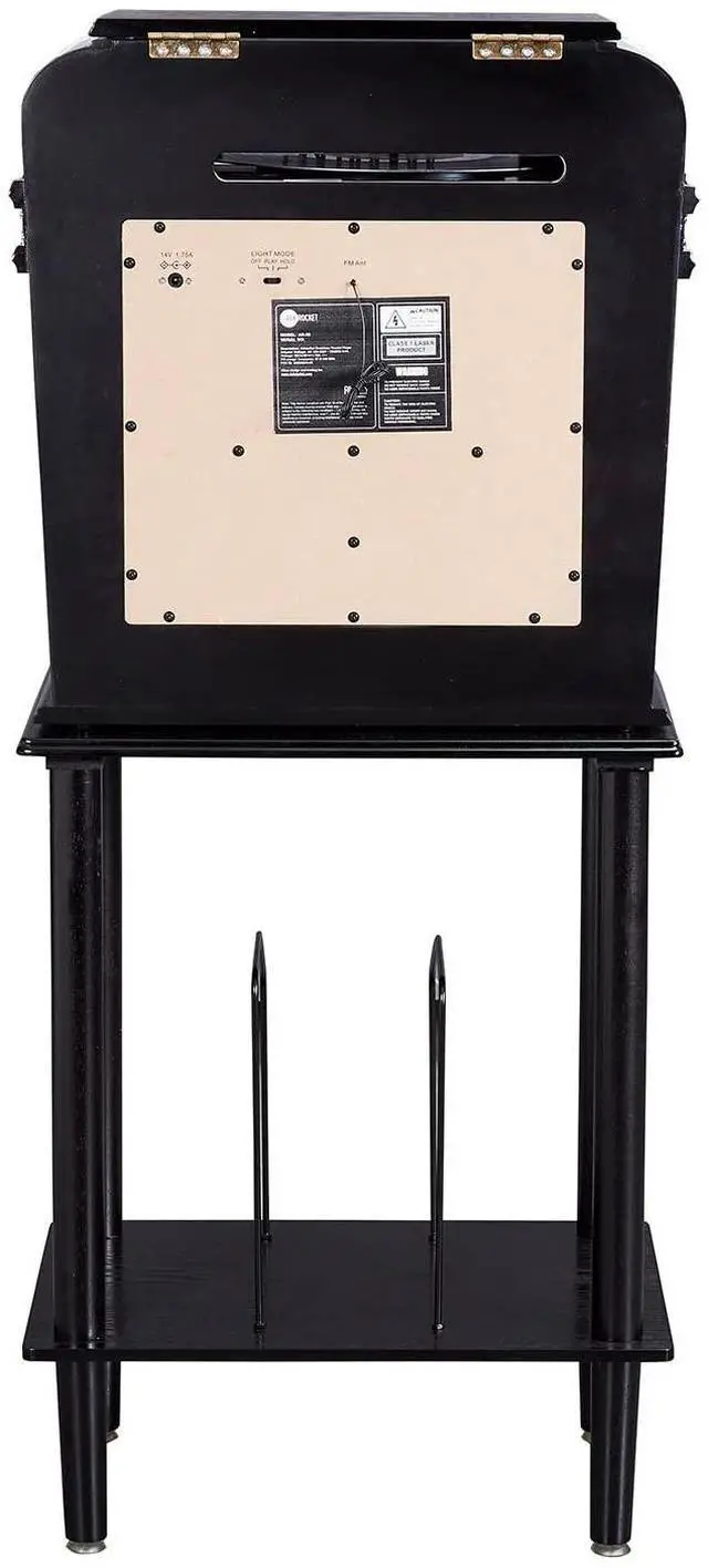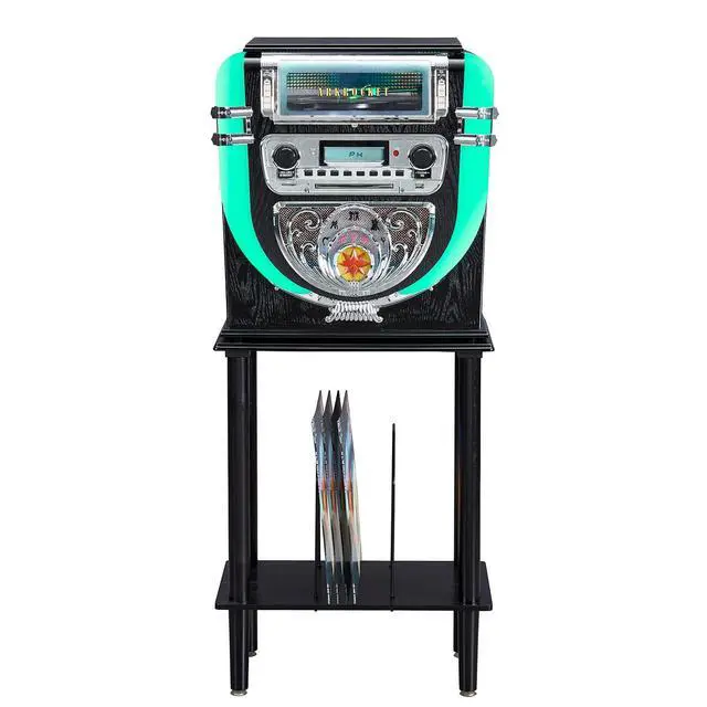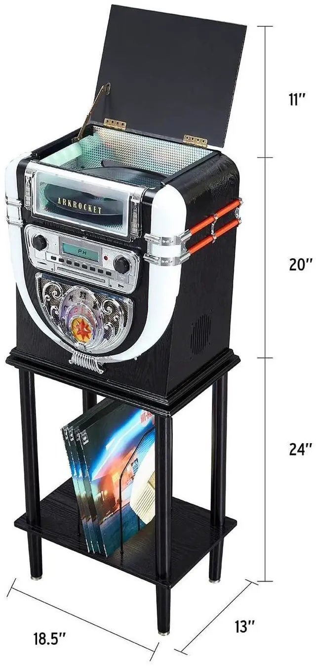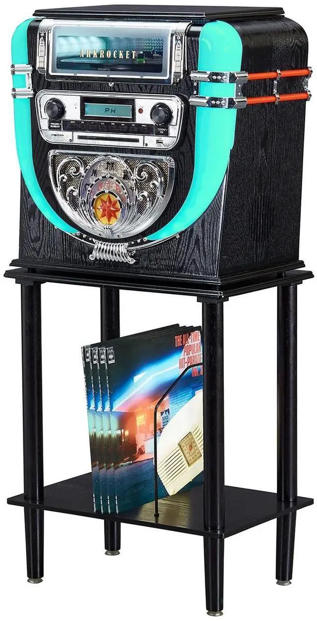 Retro 1950s Jukebox Design Embrace the nostalgic look of a 1950s-style jukebox with a classic wood-look cabinet and eight-inch built-in vinyl storage standstyled to suit any vintage-focused decor. ^^ 3-Speed Vinyl Turntable with Rocket MM Cartridge Enjoy pure analog playback with a 3-speed record player (33/45/78RPM), auto-stop feature, and pre-installed high-fidelity Rocket Moving Magnet cartridge for rich, protective sound.