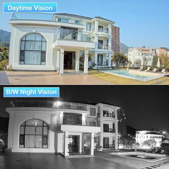 ^^ NIGHT VISION: The camera automatically switches to infrared night vision mode in low light or complete darkness, with an infrared range of up to 120 feet, providing clear black-and-white surveillance images.