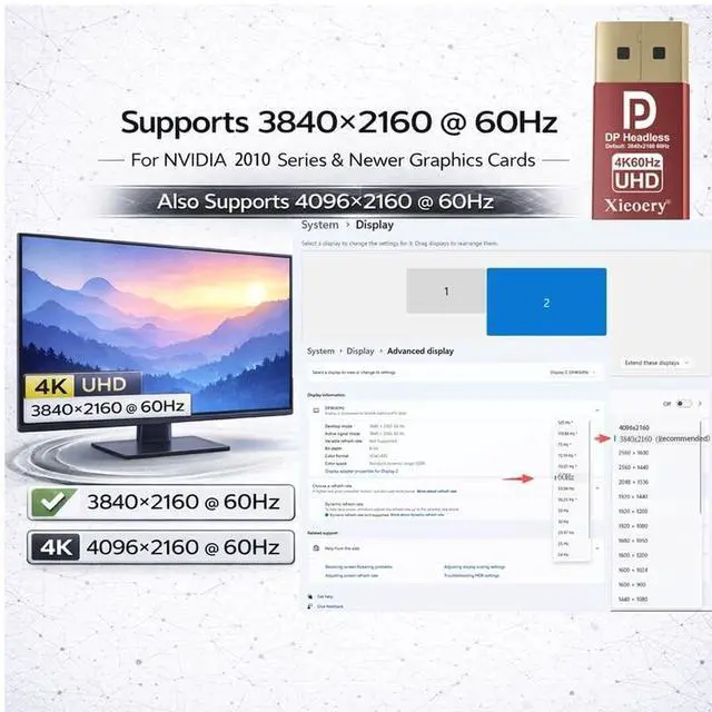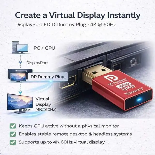 FFull 4K60Hz, Ultrawide, High-Refresh 1920x1080 (60Hz / 120Hz) Support Built with a high-quality EDID profile that supports 40962160 60Hz, 38402160 24/30/50/60Hz, 38402160 60Hz, 25601440 up to 144Hz, and 1080p up to 120Hz. Perfect for gaming, video walls, remote desktops, servers, and GPU-intensive workflows. ^^ FStable 3840x2160@60Hz Default Output for Remote Desktop & Virtual Displays Provides a clean 1080p60Hz/120Hz default signal, eliminating blurry low-res remote sessions. Works flawlessly with RDP, Chrome Remote Desktop, TeamViewer, AnyDesk, Parsec, Shadow PC, and more.
