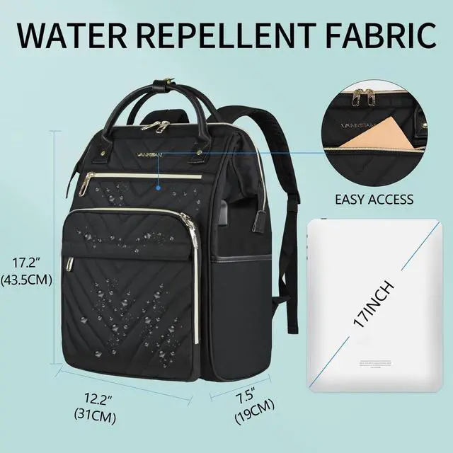 ^^ LARGE CAPACITY: Total 4 compartments and two side pockets - 1 main compartment fits 17 inch laptop -plus an extra padded sleeve for tablets or Kindle, head speaker and business files can also be stored while still having room for daily necessities, 1 front compartment, and 2 front pockets provide plenty of capacity for the organization - cards, wallet, sunglasses, etc. ^^ USB CHARGING PORT & RFID BLOCKING: VANKEAN work bag has a USB charging port extended on the side of the backpack and built-in a charging cable inside, it offers easy access to charge your phone (POWER BANK is not included). RFID design pockets protect your personal information security, there are three card slots. No more worries about data theft by RFID scanners.