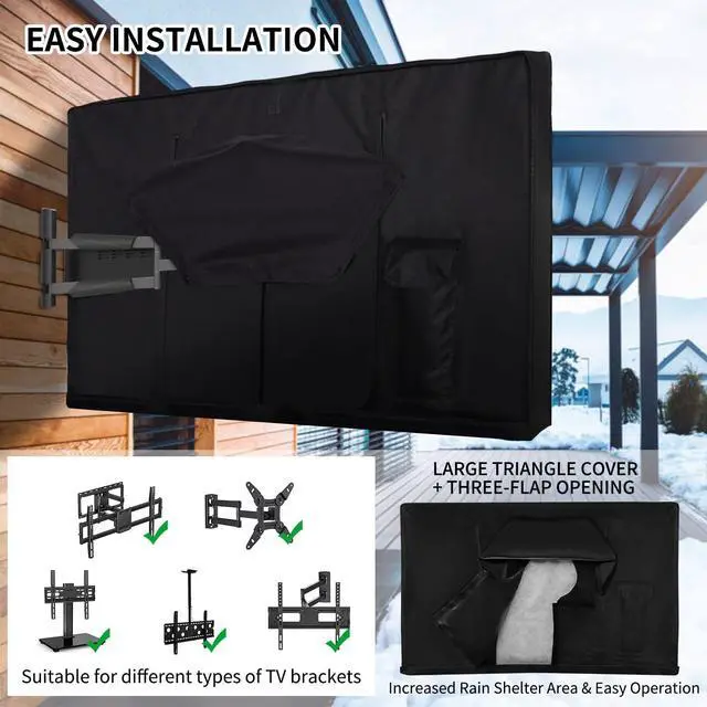 Durable & Protective MaterialThe outdoor TV cover is made of 600D Oxford felt cloth and PVC coating. Not only can it prevent the TV from rain and effectively protect the TV screen from scratches; it can also provide additional insulation to ensure the normal operation of the TV in the cold season. ^^ Universal Size Compatibility- 51''L x 30''H x 4.5"W, DIAGONAL LENGTH=SIZE OF TV=55". Please measure the external dimensions of your TV including frame before purchasing to ensure compatibility. Make sure all parts are fully covered to provide the best protection. Fits most brands of LCD LED flat screen TVs.
