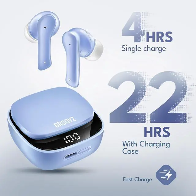 ^^ Crystal Clear Conversations: Communicate seamlessly with dual microphones featuring advanced noise reduction, ensuring every word is heard even in busy environments. With Groovz wireless earbuds, experience clear sound on both ends of the call. ^^ Battery Life at a