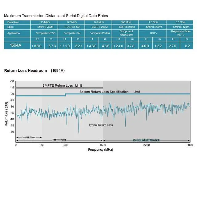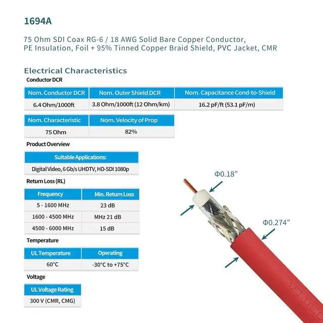 Special Connector: Gold plated ^^ This sdi camera cable is made with Belden 1694A; 18 AWG, Supports Full 3G/6G Bandwidth for 1080P, 4K Video ^^Standard Definition SD-SDI (270 Mbps, ST 259) HD standard HD-SDI ( 1.483 Gbps, ST 292) 3G-SDI ( 2.97 Gbps, ST 424) 6G-SDI ( 5.94 Gbps, ST 2081) 12G-SDI ( 11.88 Gbps, ST 2082) ^^ BELDEN 1694A PRECISION SERIAL DIGITAL VIDEO COAXIAL CABLE: features exceptionally low attenuation and a 4.5 GHz Bandwidth in an RG6 type coax cable. Featuring RG-6/U type, 18 AWG solid, good for long sdi cable ^^ This sdi cable Is suitable for HDTV and professional