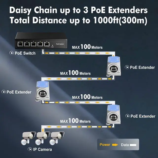 Input/Output: 1/2 (+), 3/6 (-), 4/5(+), 7/8(-) ^^ Outdoor IP67 Weatherproof Industrial grade aluminum die-casting body, nylon waterproof joint, cable interface all protected in the shell, with better waterproof, dustproof, snowproof effect, more suitable for outdoor use; also suitable for complex indoor environment, such as warehouses, computer rooms, garages, attics, etc. ^^ Plug & Play Support power detection automatically detect devices, just plug in the ethernet cable, connect directly to the device, led display the port status, without configuration. *Please note not support 24V passive PoE*. ^^ Easy Install Support wall mount, smaller size save space, LED indicators clearly show port status, suitable for many positions. Support 3-level cascading, can connect poe AP, camera, phone and other POE devices, extender POE coverage at low cost at variety of complex environments