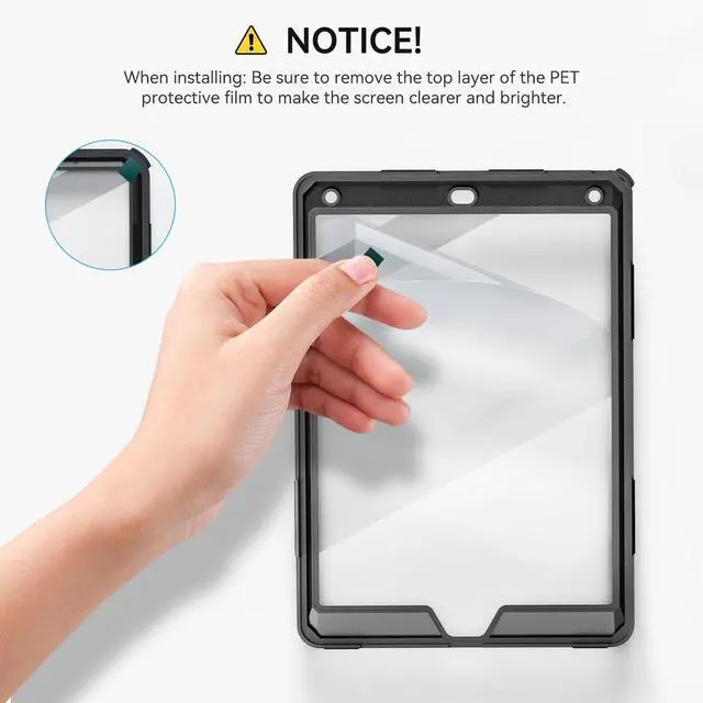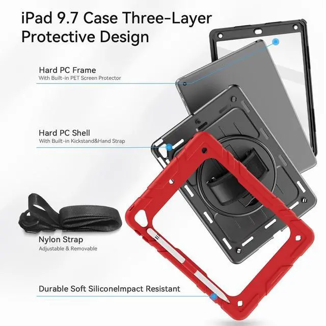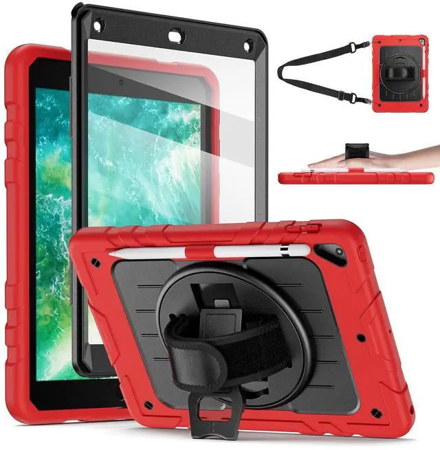NOTE: This ipad 9.7 inch case WITH built-in screen protector. ^^ 360Rotating Kickstand & Hand StrapRotatable kickstand easily support your iPad in multi-angle viewing. Moreover, the soft hand strap allows you to hold your iPad firmly and prevent accidental drops. Convenient for studying, gaming, watching video, etc. ^^ User-FriendlyDetachable & adjustable shoulder strap attach the strap to any two corner holes of this iPad 10.2 Case. Carry your iPad conveniently wherever you are at home, at work, or on a trip. Precise cutouts for easy access to the speakerand other ports. ^^ What You GetElastic loop band beside the hand strap stores your Pencil easily, no trouble of finding your Pencil (Pencil Not Included). If you have any questions of our case for ipad 6th/5th generation, please feel free to contact us at any time. We sure all the question can be solved properly.