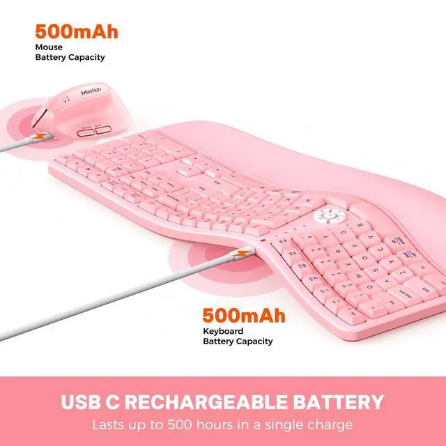 PU material (dimensions: 18.8 4.9 inches), it provides solid and reliable support for hands and wrists. Its sturdy construction ensures it won't collapse or shift during use, while the non-slip surface enhances grip. This design helps alleviate wrist pressure through consistent, stable support, enhancing comfort during extended keyboard use. ^^ VERTICAL ERGONOMIC MOUSEFeaturing a unique vertical design with four adjustable DPI settings (800/1200/1600/2400), it adapts to diverse usage scenarios and operational preferences, balancing precision with efficiency. Equipped with silent buttons and a side scroll wheel, it meets varied usage demands. Both mouse and keyboard share a single USB-A receiver for enhanced convenience. ^^ RECHARGEABLE AND LONG LASTING Both the keyboard and mouse feature built-in 500mAh rechargeable batteries, delivering up to one month of continuous use on a single full charge. This extended battery life supports extended usage, allowing you to focus on your work without worrying about recharging. (Please charge the keyboard and mouse before use. We recommend using a 5V 1A charger. )