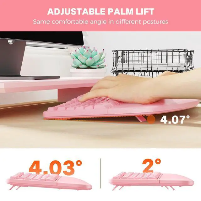 Each key features a tilted design to promote more natural typing motions, further reducing strain on fingers, palms, and wrists. The keyboard measures 19.09 10.04 1.83 inches (weighing 2 pounds), wider than a standard full-size keyboard. While it occupies more desk space, it provides ample room for your hands to move freely, enabling comfortable and fluid typing. The mouse measures 2.87 4.09 2.28 inches. ^^ FIRM PU WRIST REST - Engineered for StabilityFeaturing a pillow-shaped palm rest crafted from durable