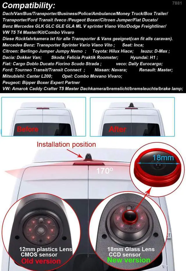 Dear customer, Please must check the camera size and appearance before place a order, see if can fit your car brake light lamp place size and appearance! Because the same car model in different countries may have some difference, please check the camera size and compare the installation of your car carefully to avoid mistake. This product could fit for all below models as expected: For Benz sprinter vito viano Citroen Dacia Fiat Ford Hyundai Isuzu Iveco Mitsubishi Nissan Opel Peugeot Renault Seat skoda Toyota VW crafter T5-
