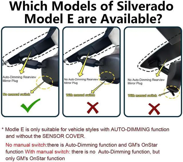 With manual switch: there is no Auto-Dimming function, but only GM's OnStar function, please refer to picture 2 ^^ Please NoteYour car must have an Auto-Dimming Rearview Mirror Plug Power Adapter (10Pin square plug), otherwise, power can only be obtained through OBD or Fuse box. Parking monitor must have OBD Power Adapter or Fuse Box