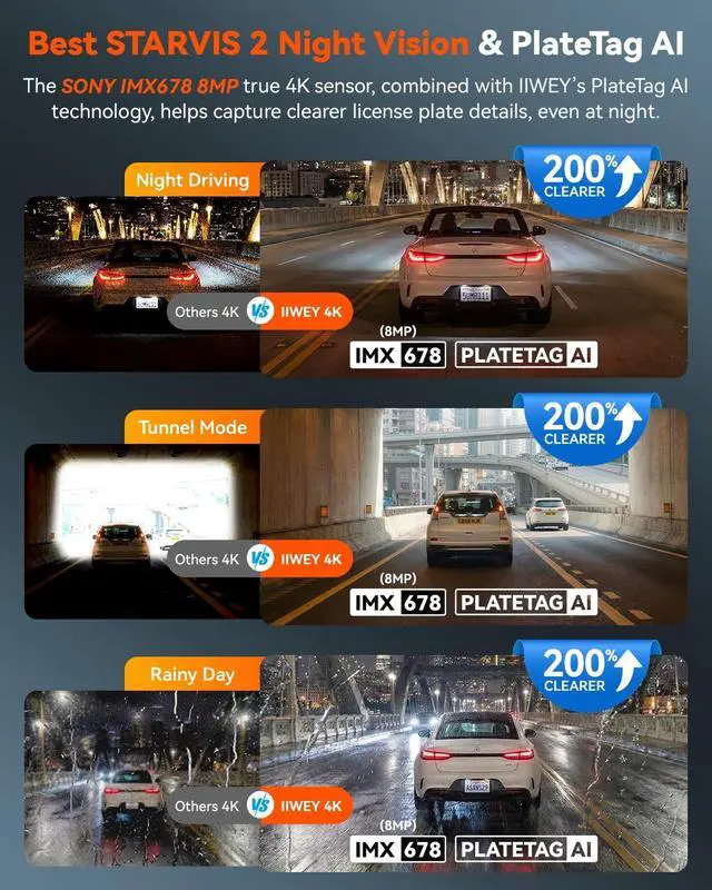 SMART ACCIDENT RETRIEVAL: Don't waste hours scrubbing through footage. Our exclusive PlateTag AI uses deep learning to automatically detect and highlight license plates within the IIWEY App while playback the videos. Combined with HDR 3.0 to suppress headlight glare, it transforms chaotic road scenes into organized, searchable evidenceeven at high speeds. ^^ 24/7
