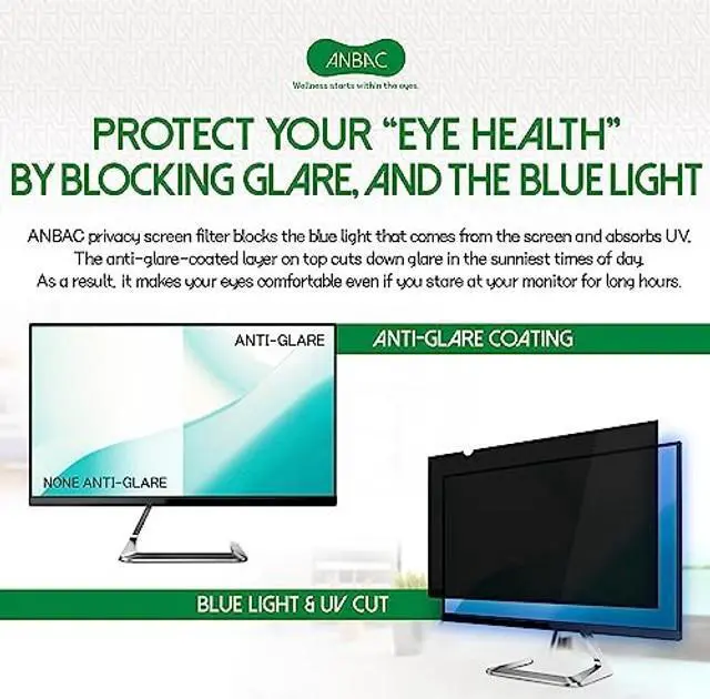 SMUDGE PROOF & DURABLE PRIVACY GUARD ANBAC attachment type privacy screen filter protects your screen from others view. The advanced micro-louvre technology of the filter enables you to see a clear screen at the front and limits your screens viewing angle beyond 30 degrees to the left and right from your center view. Plus, additional coatings prevent fingerprints and scratches on the screen. These coatings help keep the filter free of smudges, dents, and allow for long-term usage. ^^ FOR EYE HEALTH Protect your eyes from blue light, and other harmful rays! The privacy screen filter reduces blue light exposure from screen, and blocks harmful rays from sunlight reflection.