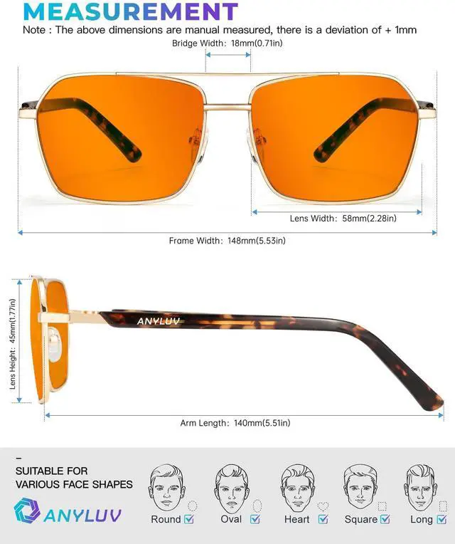 Blue Light Blocking Rate: 99% These blue light gaming glasses can filter 99% of harmful blue light from computers and other devices, help release eye fatigue. When you playing game on electronic screens for long time, these ANYLUV blue light gaming glasses for men can help make eyes relaxed, meantime improve sleep quality ^^ Amber Blue Light Blocking Glasses This type of blue light glasses lens can effectively blocks almost all blue light, alleviating eye fatigue. providling outstanding blue light protection. Recommended for wearing during electronic gaming time, and contributes to better sleep. ^^ Trendy Blue Light Glasses Designed with square slim frame and ANYLUV logo decor temple, very exquisite and fashion style. These anti blue light glasses help show a sophisticated look that complement any outfits, whether you're working or casual daily life ^^ Upgraded Metal Material Lightweight metal frame and temple make the blue light glasses men more durable and high quality. Soft rubber nose pad comfortably fit your nose and isn't slipping easily ^^ After-Sales Brand Service ANYLUV attach great importance to product quality and customer satisfaction. Each customer can enjoy after-sale brand service for our reading glasses.