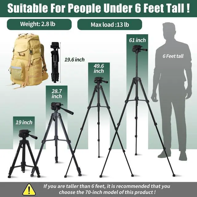 Mid mounted load-bearing hook can suspend counterweights to enhance tripod stability. ^^ Note and After-Sales Service This tripod has a maximum working height of 61 inches and is suitable for people under 6 feet tall. If your height exceeds 6 feet, it is recommended to choose the 70 inch model of this product. If you have any questions about the product, please feel free to contact us. We will reply to you within 24 hours and provide technical support.