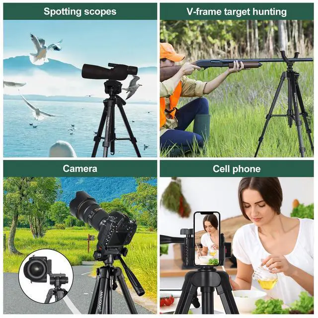 It can also be installed on the head of a tripod and used for targeting moving targets during hunting. It is also compatible with professional cameras, smartphones, or other devices with a inch interface. We have included a phone holder with the package as a gift. Convenient for you to connect your phone and use. ^^ High Quality MaterialsThe spotting scope tripod is made of aviation grade aluminum alloy containing magnesium and silicon. It has high strength, strong corrosion resistance and oxidation resistance, and weighs only 2.8 pounds. The height can be adjusted in a range of 19 to 61 inches.