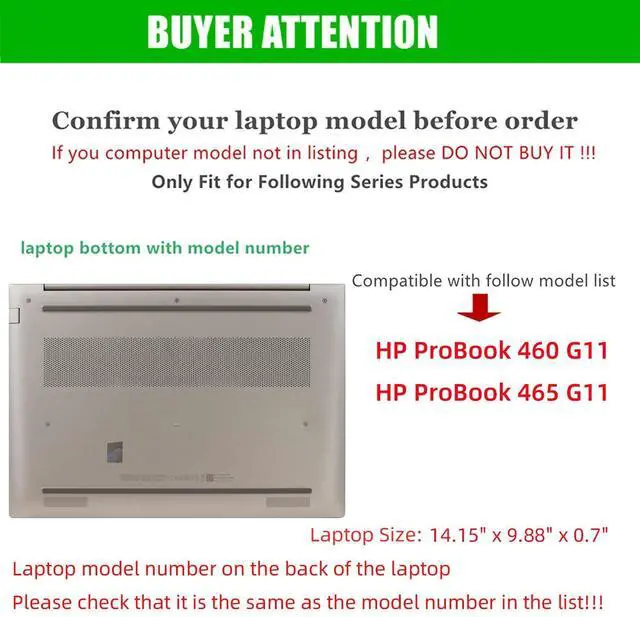 • Dimensions: laptop size (L X D X H): 14.15" x 9.88" x 0.73". This case is compatible with for 16-inch HP ProBook 460/465 G11 Series Notebook PC (Please check your laptop model!!!)