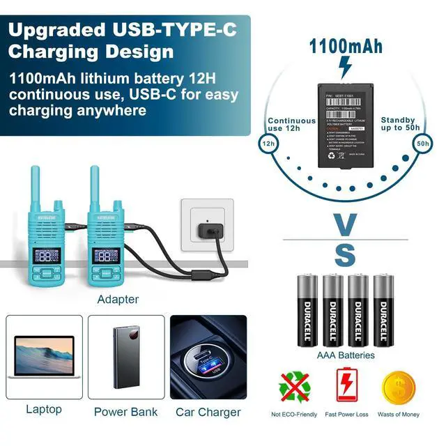 ^^ Versatile Features and User-Friendly DesignPalm size; Light weight; Push to talk (PTT) button; 10 call tone settings; Keypad lock; LCD screen with backlight, Convenient Type-C charging interface, 3 VOX-hands free, LED flashlight, NOAA Weather & Alert. ^^ With Air Acoustic Tube EarpieceThis USB C earpiece is an original headset for T1 walkie-talkies. High performance sensitive PTT mic speaker and acoustic tube ensure sound to be transmitted clearly even in loud environment. ^^ High-Quality After-Sales Service 3-year warranty. Complete accessories include 2 FRS Radios, 2 Earpiece, 2 Li-Polymer Batteries, 1 Dual Port TYPE-C USB Charger Cable, 1 AC Adapter, 1 User Guide.