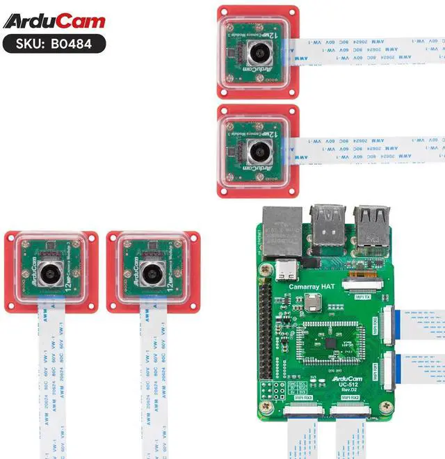 {Stereo Synchronized}: This Arducam for Raspberry Pi camera is designed for Arducam IMX708 Wide Angle Camera Module 3, both video and photographs are available, and the clock is synchronized (accurate to the millisecond level). Achieves full hardware-level frame synchronization for four cameras, eliminating the need for additional time-stamping schemes. ^^ {Four in One}: Combines four autofocus cameras into a single frame, each operating at a 1/4 resolution (1152648), resulting in maximum outputs of 46082592 for still images and 19201080 for video. (Note that frame rates are halved compared to single-camera operation. ) ^^ {Flexible Control}: Default operation in quad-channel mode ensures simultaneous image and video capture. This wide-angle camera kit can also support channel switching (Single/Dual/Quad) for versatility. ^^ {Exact V3 Function Match}: This camera kit is modified based on Raspberry Pi camera module 3 for compatibility with the IMX708 enabling shared I2C signals and clock while retaining original features such as PDAF and HDR. ^^ {Variable Baseline Extension}: Arducam Camarray HAT implements Variable Baseline Extension to achieve synchronized stereo vision across multiple cameras. ^^ Quick start guide: bit. ly/QuickStartGuide-B0484
