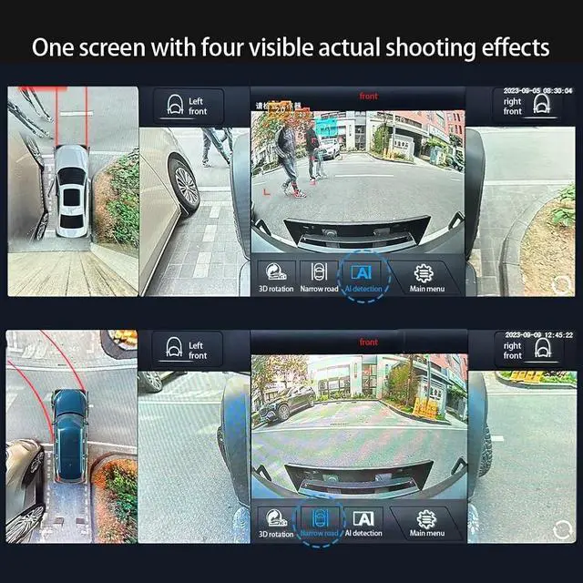 360 Panoramic View4 IP67 waterproof night vision 1080P cameras, can be installed in the front, rear, left and right of the car, record data, come with knob controller, easy control, enjory parking, bring you more convenience. ^^ AI Proactive AlertingEquipped with AI intelligent function, by recognizing and only recognizing pedestrians and motor vehicles, it will automatically open the 360 panoramic view, review the environment around the car, and can accurately display the distance between the front car, so as to improve driving safety. ^^ Reduce Blind Spots360Bird's Eye View Camera System helps a lot in various driving situations, such as reverse parking, eliminating most of the blind spots, makes much easier for parking and passing the narrow road.