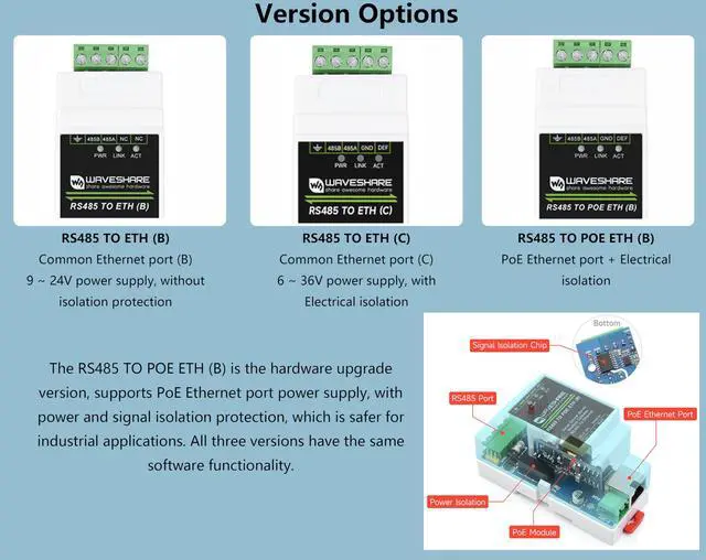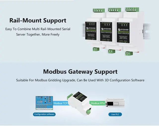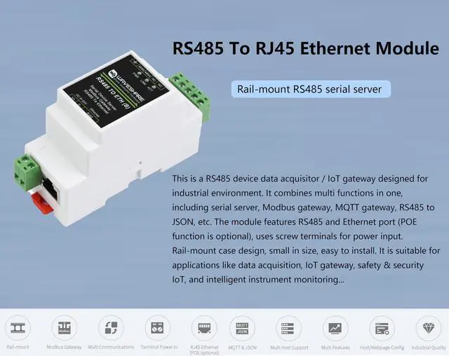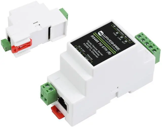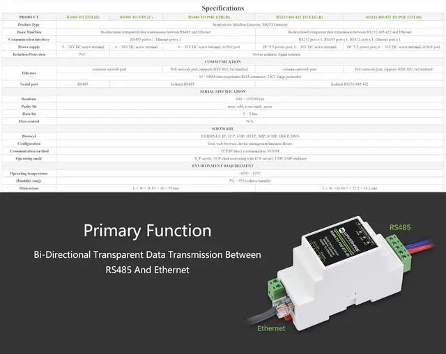 TO ETH B: 9 ~ 24V power supply, without isolation protection), uses screw terminals for power input. Rail-mount case design, small in size, easy to install. It is suitable for applications like data acquisition, IoT gateway, safety & security IoT, and intelligent instrument monitoring... ^^ Bi-directional transparent data transmission between RS485 and Ethernet. Support Rail-Mount, easy to combine multi rail-mounted serial server together, more freely. Support Modbus Gateway, suitable for Modbus gridding upgrade, can be used with 3D configuration software. ^^ Multi communication modes, supports TCP server / TCP client / UDP mode / UDP multicast. MQTT/JSON to Modbus, more flexible conversion between different protocols. ^^ Support Multi hosts roll-polling, different network devices will be identified and responsed respectively, no more crosstalk issue while communicating with multi network devices. Support NTP protocol, getting network time info for serial output or data upload. ^^ Multi configuration methods, supports Web browser configuration, obtaining dynamic IP via DHCP, DNS protocol connected domain server address. ^^ Comes with Online Tutorial Usage Guide and Online Development Resource, Please