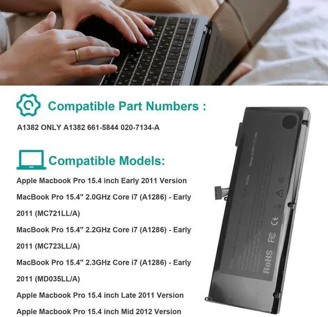 Compatible with Macbook pro 15 inch A1382 Laptop Battery is only for Macbook pro 15 Inch A1286 Early 2011 versions, Late 2011 versions, Mid 2012. MC721LL/A, MC7