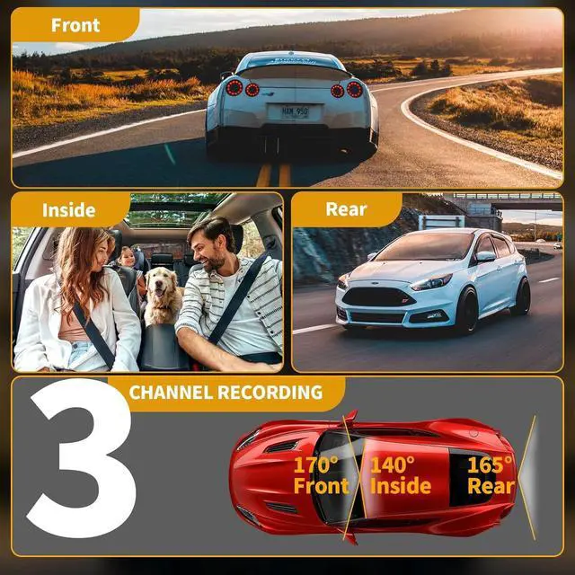 3-Channel Dash Cam & Supersized Wide AngleDash cam can help you read key details such as road signs and vehicle license plates more clearly, bringing you better driving pleasure and better security. This car camera is equipped with a 170 wide-angle front camera and a 160 wide-angle internal & rear camera, recording everything you need. ^^ Clearer Night Vision & Parking MonitorDash cam wide-angle lens that automatically adjusts the brightness of the lights to capture smaller details such as license plates even in low-light conditions. Dash camera will automatically start recording when vibration is detected in the event of a collision or someone attempt to steal your car, providing 24h protection for your vehicle.