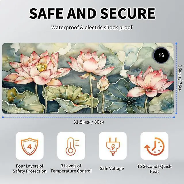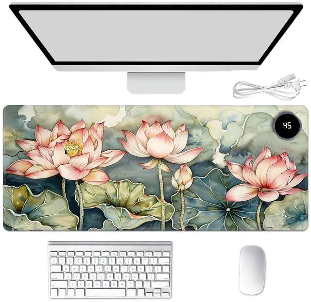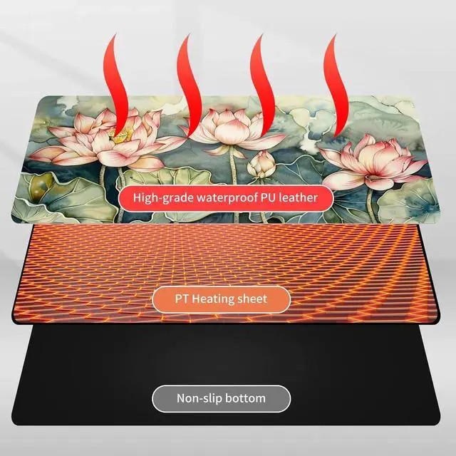 Heated Mouse Pad Hand Warmer, Warm Desk Pad Mousepad Desk Mat with 3 Levels Heating and Auto Shut Down 31.5 x 13 inch PU Leather Warmer Keyboard Mat for Gaming Laptop Office Home, Art Lotus Flower