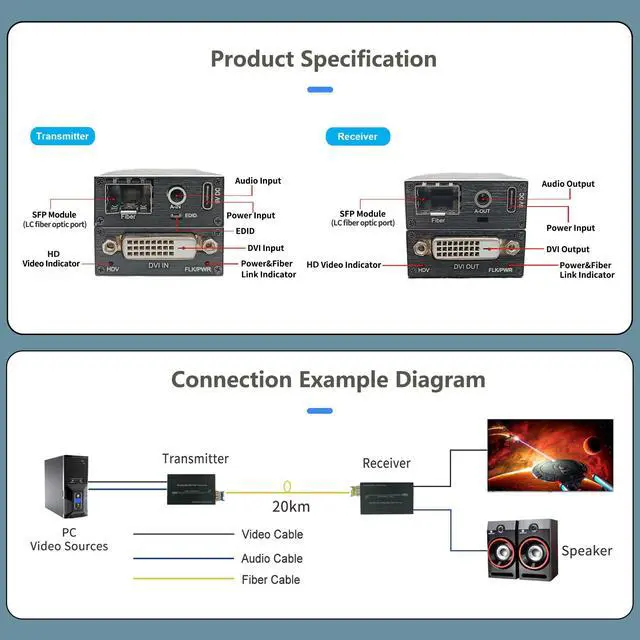 4K DVI Optical Transceiver can be used for a wide range of applications requiring long distance transmission of high resolution with high quality by its good stability and powerful security ^^ DVI Fiber Converter with external stereo audio, transmits DVI video signals and audio up to 20km over a single fiber optic cableData rate up to 10.2G bps, DDC HPDT Signal Support ^^ Compliant with DVI 1.0 and HDCP 1.2 specifications, Supports All Modes up to maximum 4K*2K@60Hz, YUV