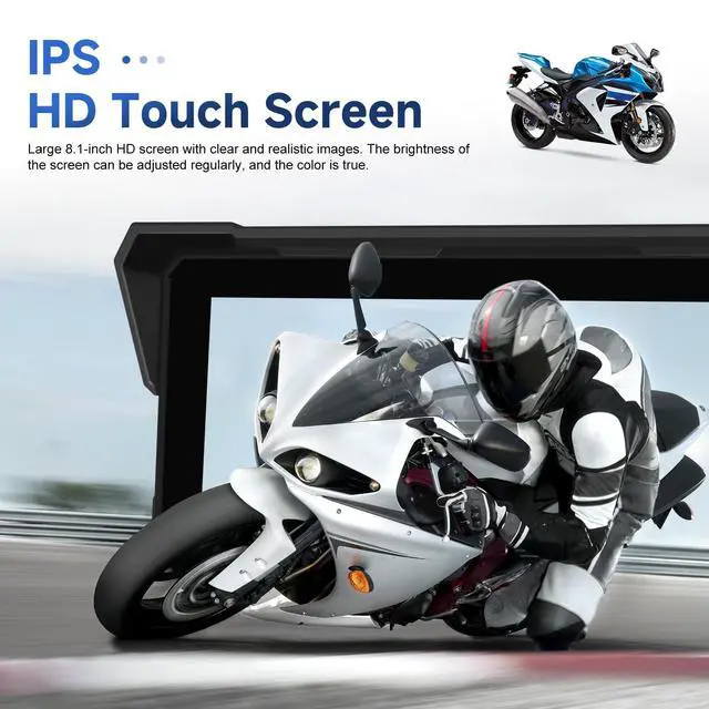 Your 8.1" Motorcycle Command Center 8.1 -inch ultra HD touchscreen is your ultimate hub, seamlessly wireless CarPlay Android Auto for motorcycle and effortless smartphone control. Powered by a stable Android with a high-performance chipset and 2GB+32GB memory, it delivers fast, smooth operation. Enjoy built-in GPS navigation, IP68 waterproof, Bluetooth, and rich media playback via TF card. Pre-installed apps and multi-language support make it the versatile, smart display your motorcycle deserves ^^ Crisp 8.1" Touchscreen + Robust Bracket = Perfect ViewCommand your ride on a vibrant 8.1 -inch ultra HD display (1600*600 resolution).