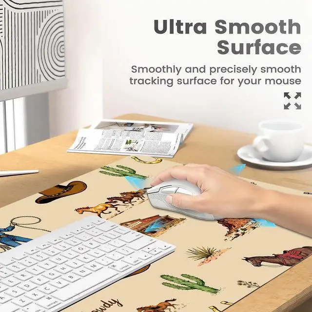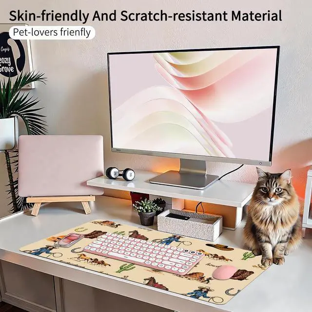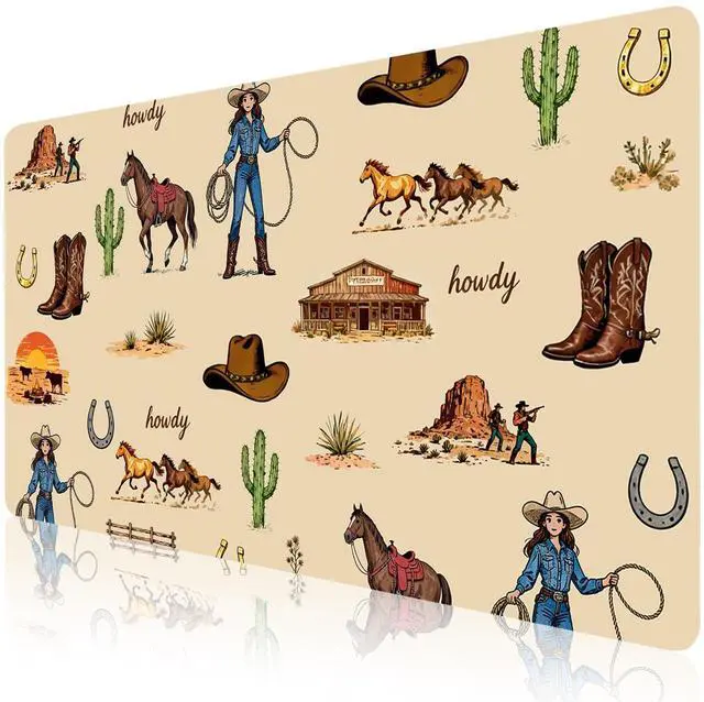 Clean: Protect your desk with our Retro West Cowgirl easy-to-clean desk mat. This stylish Farm Pattern table mat pad waterproof surface ensures effortless maintenance. This large table mat provides us with a comfortable touch while protecting the tabletop from scratches. including scratches, stains, spills, and heat. Cleaning is a breeze; just wipe it with a damp cloth or tissue. Smooth Surface Desk Mat The aesthetic table mat's smooth surface allows for quick mouse movement while maintaining excellent accuracy and control. The stylish Farm Pattern desk mat's premium material offers maximum comfort for your wrist whether you're writing, typing, browsing, sliding your mouse, gaming, or even restingBeautiful Desk Mat for